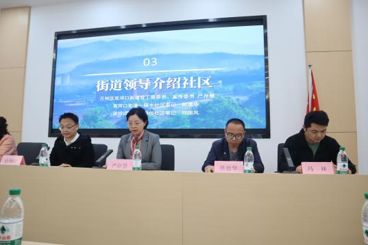 双河口街道党工委委员、宣传委员严存慧围绕辖区治理实际,对一碗水社区、螺丝包社区的人口结构、服务短板及居民需求进行了系统介绍,进一步明确了调研的现实场景与问题导向。一碗水社区书记熊德华、螺丝包社区书记程国凤参与交流指导。万州区德立社会工作服务中心主任冯林结合基层治理实际需求,解读了本次大赛的赛题设置与实施路径,重点围绕社会工作服务满意度调查、社区便民服务需求调查等方向,对调研方法规范、成果转化要求及赛事安排进行了说明。
