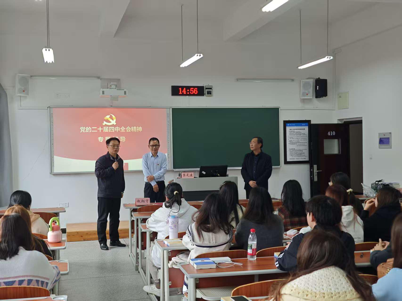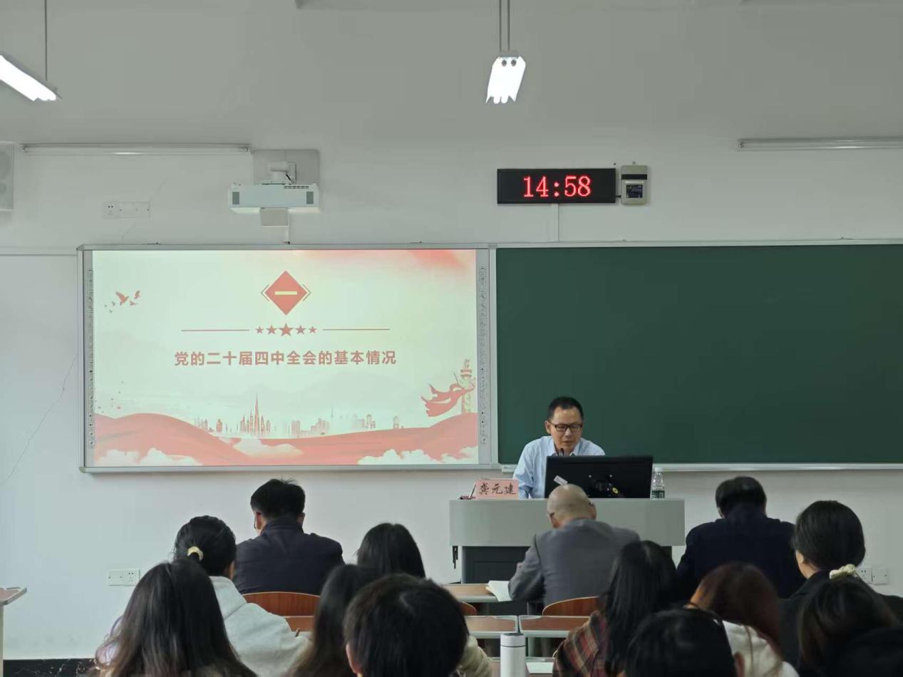 为深入学习领会、全面准确把握党的二十届四中全会精神的重大意义和核心要义,引导广大师生把思想和行动统一到党中央决策部署上来,2025年11月4日,我校特邀万州区委党校副校长龚元建同志来校,为科研处学报三峡研究院党支部与公共管理学院部分师生作党的二十届四中全会精神专题辅导。会议由公共管理学院赵翔宇同志、三峡研究院王志清同志共同主持。